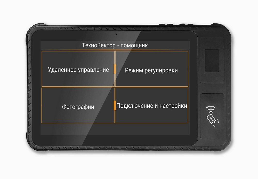 Защищенный планшет для удаленного управления стендами ТехноВектор оснащен процессором Media Tek и системой Android 11.0, обеспечивающей хорошую вычислительную производительность. Большой объем памяти позволяет хранить и обрабатывать данные, обеспечивая мобильность. Планшет смонтирован в ударопрочном, водо- и пыленепроницаемом корпусе (по стандартам IP65, MIL-STD-810)